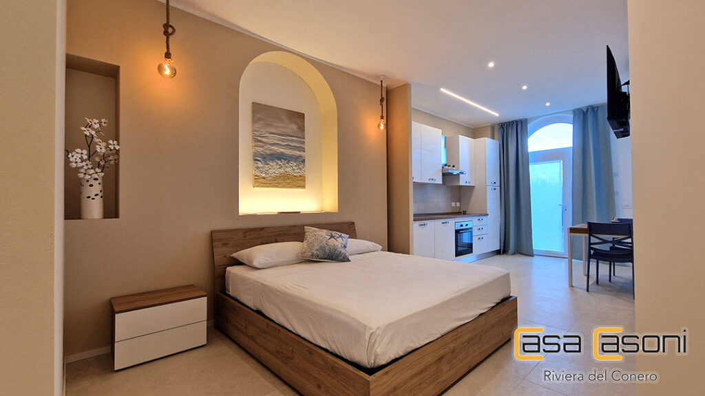 Il monolocale, con due posti letto, è la scelta ideale per coppie o viaggiatori soli che desiderano vivere l’incanto del mare con stile e praticità.